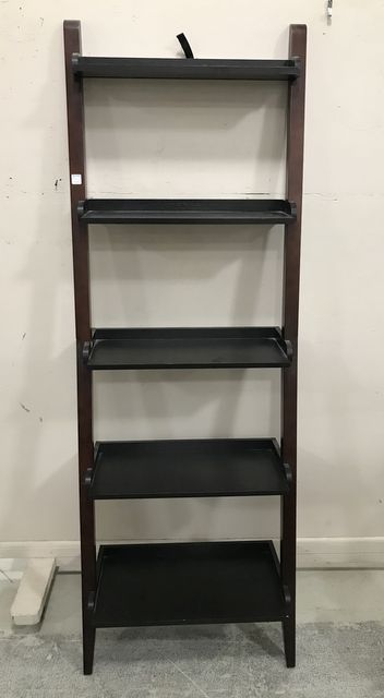 Modern Wood Lean To Display Stand, wood legs with black painted five shelves, 72"h., 22"w. Modern Wood Lean To Display Stand, wood legs with black painted five shelves, 72"h., 22"w.