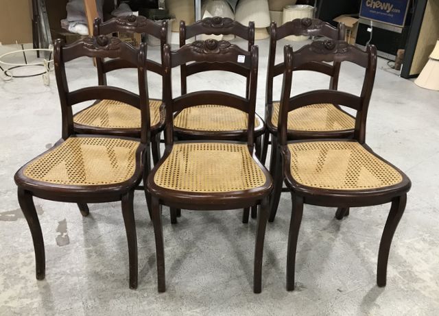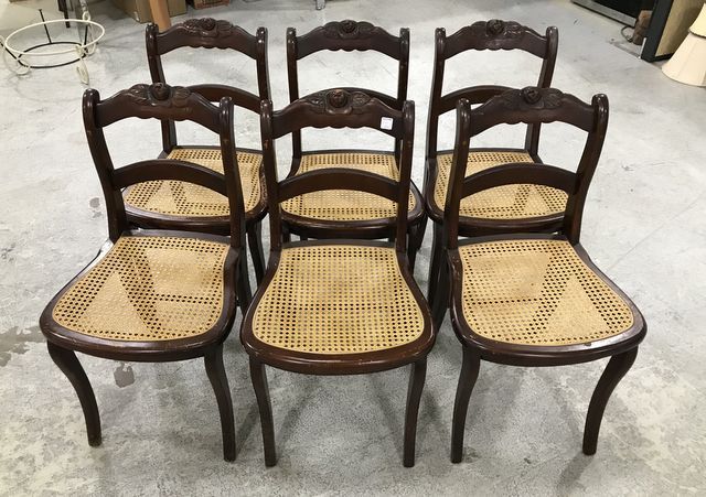 Six Vintage Mahogany Duncan Phyfe Dinning Chairs, rose carved, cane seats, has finish wear, 32"h. Six Vintage Mahogany Duncan Phyfe Dinning Chairs, rose carved, cane seats, has finish wear, 32"h.