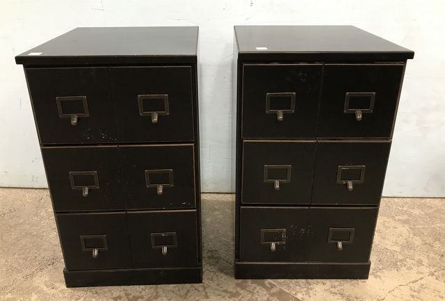 Pair of Modern Index Card File Cabinets, three drawers each, black finish, modern decor, 27"h. 16"w., 19"d. Pair of Modern Index Card File Cabinets, three drawers each, black finish, modern decor, 27"h. 16"w., 19"d.