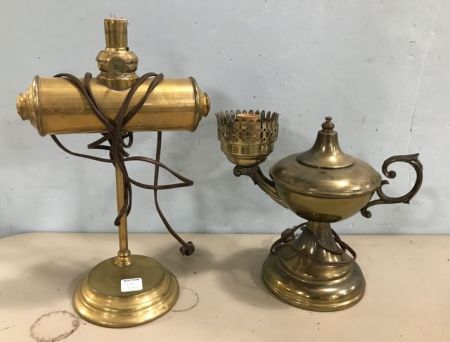 Vintage brass desk lamp, 14"h., and brass urn desk lamp. Vintage brass desk lamp, 14"h., and brass urn desk lamp.