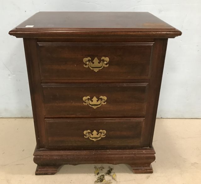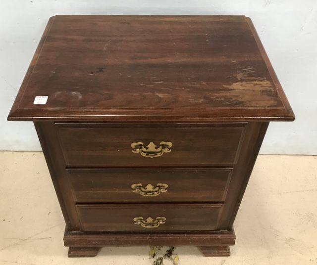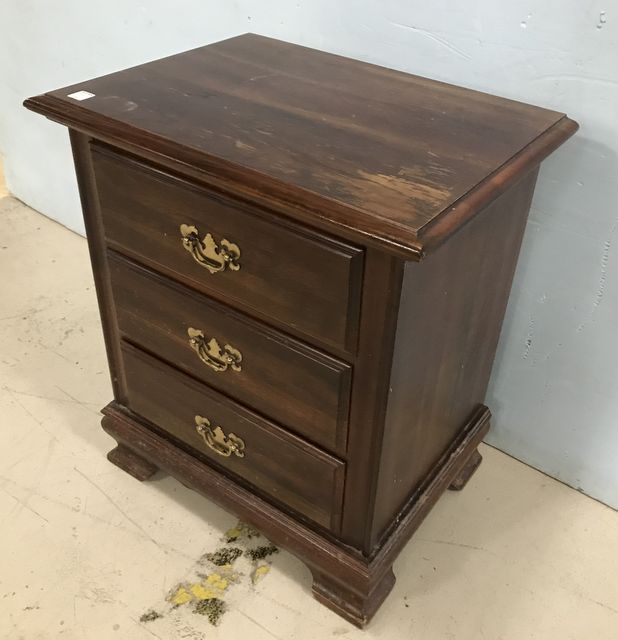 Mahogany Three Drawer Bedside Chest, has finish wear and worn areas, Chippendale style, 26"h., 23"w. 16"d. Mahogany Three Drawer Bedside Chest, has finish wear and worn areas, Chippendale style, 26"h., 23"w. 16"d.