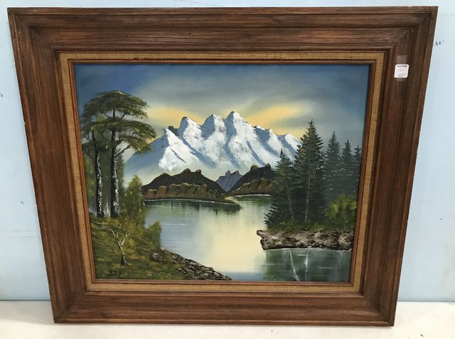 Mountain Lake View Oil Painting On Canvas, signed BRB, framed, 28"h., 32"w. Mountain Lake View Oil Painting On Canvas, signed BRB, framed, 28"h., 32"w.