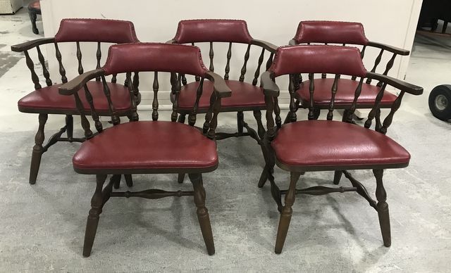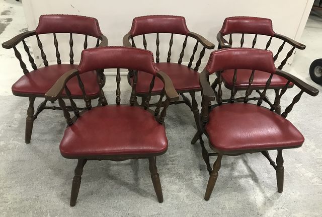 Shelby Williams Vintage Barrel Chairs, 5 total, vinyl seats, has finish wear. Shelby Williams Vintage Barrel Chairs, 5 total, vinyl seats, has finish wear.