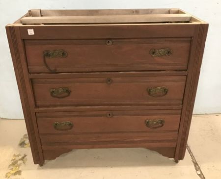 Eastlake Three Drawer Chest, needs structural work, missing top, on wheels, 35"h., 36"w., 17"d. Eastlake Three Drawer Chest, needs structural work, missing top, on wheels, 35"h., 36"w., 17"d.