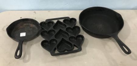 Two Iron Pans and Heart Mold pan. Two Iron Pans and Heart Mold pan.