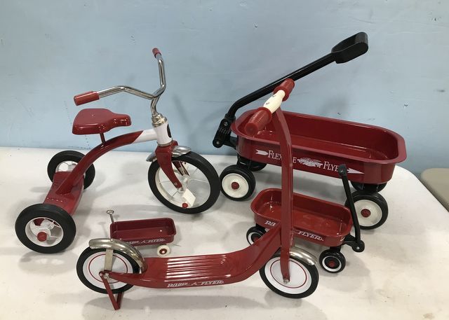 Radio flyer doll scooter, tricycle, three wagons. Radio flyer doll scooter, tricycle, three wagons.