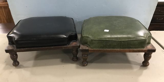 Pair of Vintage Wood Footstools, vinyl cushions, has mildew on finish, 3"h., 17"w. Pair of Vintage Wood Footstools, vinyl cushions, has mildew on finish, 3"h., 17"w.