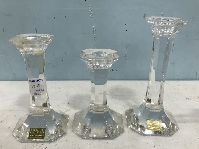 Three Crystal Candle Holders, Noble Excellence, tallest is 6"h. Three Crystal Candle Holders, Noble Excellence, tallest is 6"h.