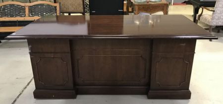 Medium Sized Cherry Executive Desk, one piece, heavy, has scuffs and few scratches on finish, 30"h., 71"long, 36"w. Medium Sized Cherry Executive Desk, one piece, heavy, has scuffs and few scratches on finish, 30"h., 71"long, 36"w.