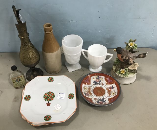 Brass pitcher, Davey Crocket Bear grease, two porcelain plates, Oriental bowl, two milk glass cups, ceramic bird figurine, stoneware jug. Brass pitcher, Davey Crocket Bear grease, two porcelain plates, Oriental bowl, two milk glass cups, ceramic bird figurine, stoneware jug.