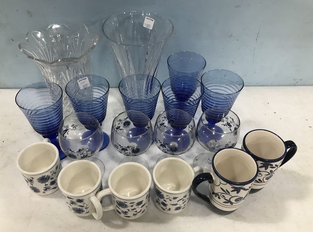 Two pressed glass vases, blue glass stemware, clear glass blue etched wine glasses, blue and white coffee mugs. Two pressed glass vases, blue glass stemware, clear glass blue etched wine glasses, blue and white coffee mugs.