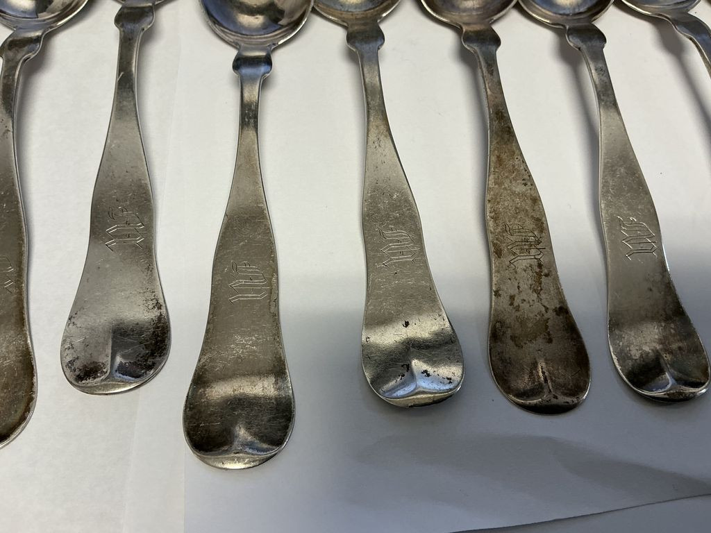 6.160 ozt Whitney and Osgood Lewiston 1868-1874 Coin Silver Spoons, Maine, monogrammed W, 12 total, 6", Location Front Glass Case 6.160 ozt Whitney and Osgood Lewiston 1868-1874 Coin Silver Spoons, Maine, monogrammed W, 12 total, 6", Location Front Glass Case