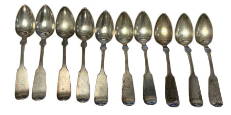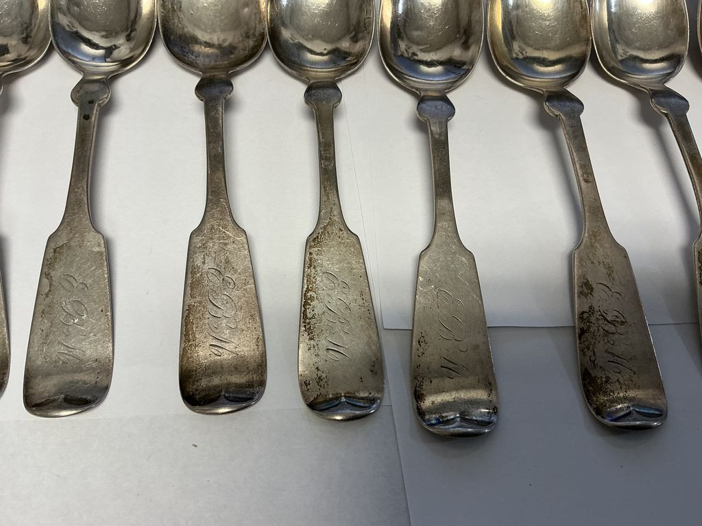 7.130 ozt William Wallace Willard Coin Silver Spoons 6", 10 total, marked WWW, 1830-1869 New York, Location Front Glass Case 7.130 ozt William Wallace Willard Coin Silver Spoons 6", 10 total, marked WWW, 1830-1869 New York, Location Front Glass Case