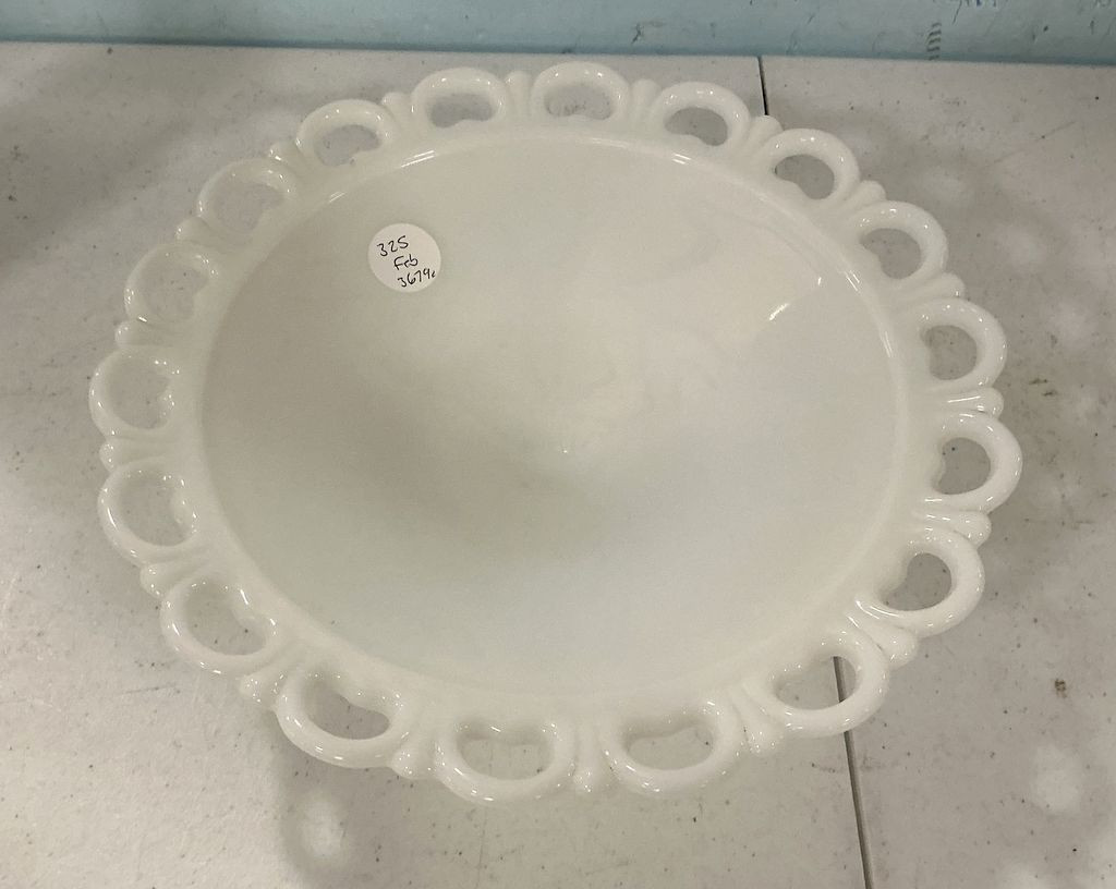Anchor Hocking Old Colony Lace Edge milk glass pedestal bowl 11" Location Front Shelves Anchor Hocking Old Colony Lace Edge milk glass pedestal bowl 11" Location Front Shelves