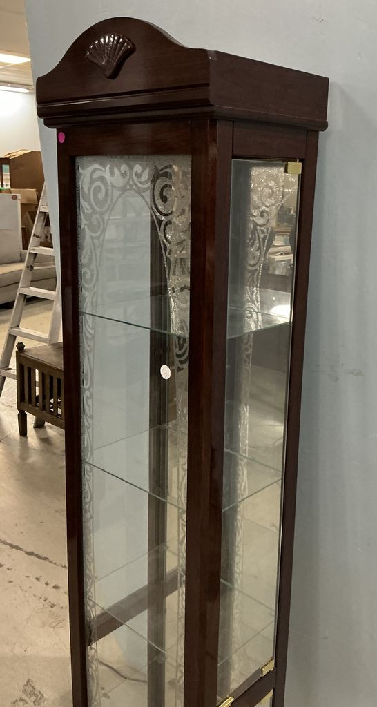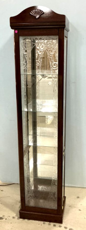 Narrow Display 75"h., 16"w, glass shelves, mirrored. Narrow Display 75"h., 16"w, glass shelves, mirrored.