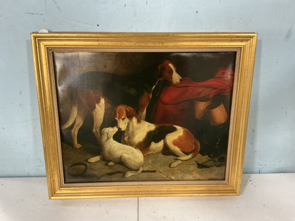 Framed Giclee Print on Canvas 20"h., 23"w of dogs. Framed Giclee Print on Canvas 20"h., 23"w of dogs.