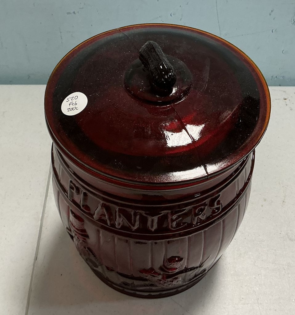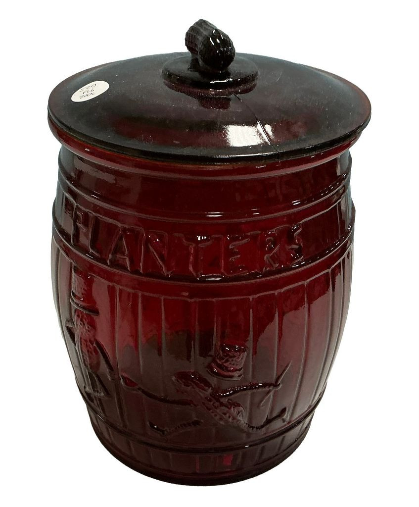 12" Red Planters Glass Jar, reproduction, Location Front Shelves 12" Red Planters Glass Jar, reproduction, Location Front Shelves