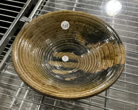 Signed Stoneware Pottery Bowl 10" Location Back Metal Shelves Signed Stoneware Pottery Bowl 10" Location Back Metal Shelves