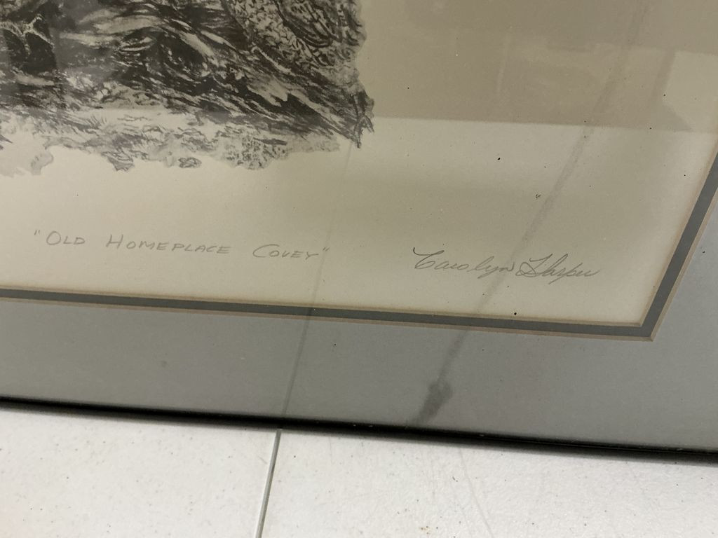 Carolyn Harper Old Homeplace Covey 43/200 Print 28"h., 22"w Location Front Shelves Carolyn Harper Old Homeplace Covey 43/200 Print 28"h., 22"w Location Front Shelves