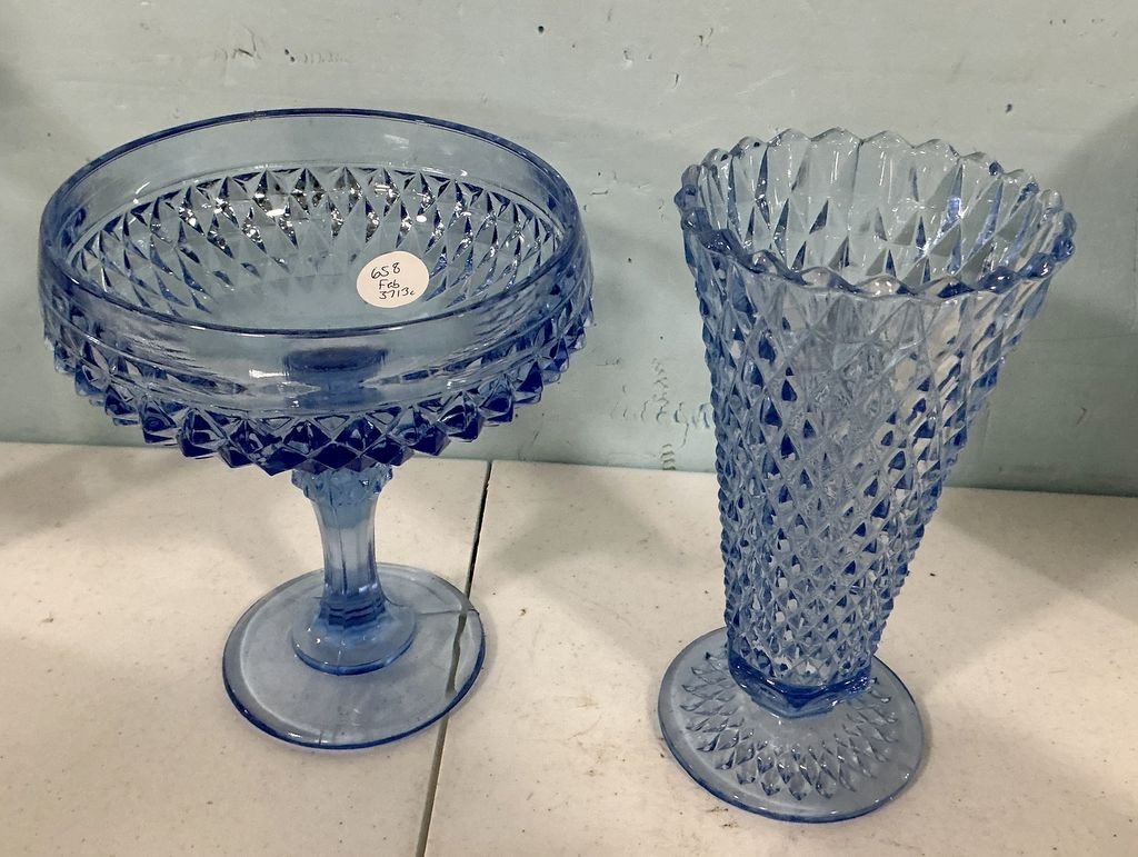 Blue Indiana Glass Diamond Point Compote and Flower Vase Location Back Metal Shelves Blue Indiana Glass Diamond Point Compote and Flower Vase Location Back Metal Shelves
