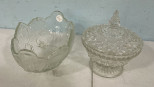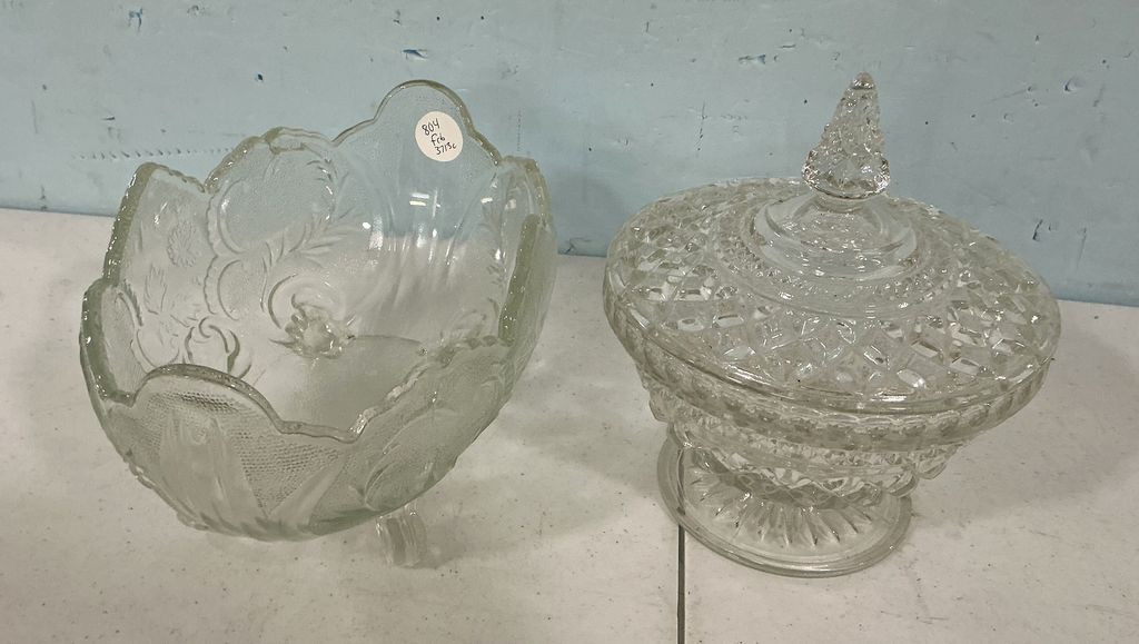Pressed Glass Candy Dish and Footed Bowl Location Back Metal Shelves Pressed Glass Candy Dish and Footed Bowl Location Back Metal Shelves