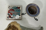 Signed Pottery Vase, Candle, Trivet Location Back Metal Shelves Signed Pottery Vase, Candle, Trivet Location Back Metal Shelves