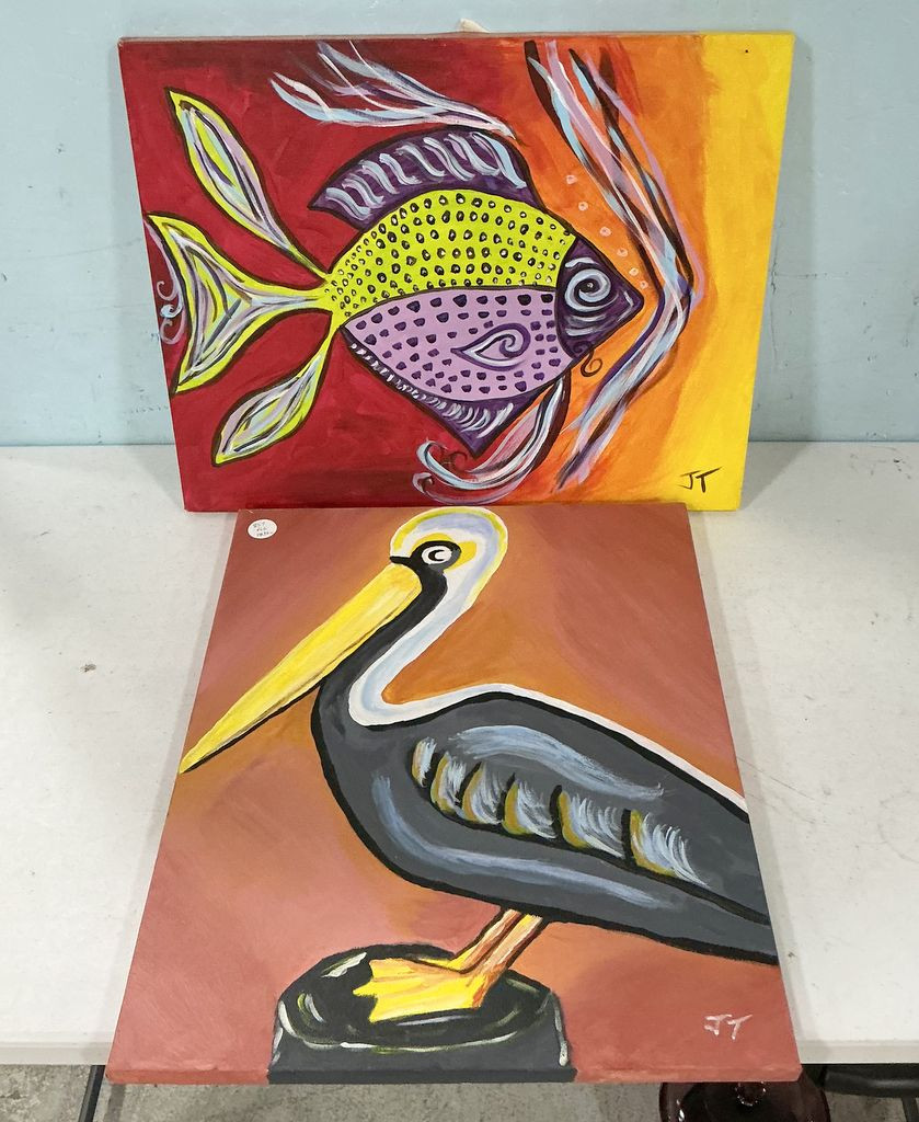 Two Signed JT Fish and Bird Paintings 16" x 20" Location by Bathroom Two Signed JT Fish and Bird Paintings 16" x 20" Location by Bathroom