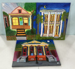 Three Signed JT Painting of Houses Location by Bathroom Three Signed JT Painting of Houses Location by Bathroom