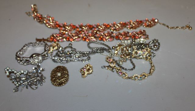 Group of Costume Jewelry; necklaces, watch, pins, broach, bracelets Group of Costume Jewelry; necklaces, watch, pins, broach, bracelets