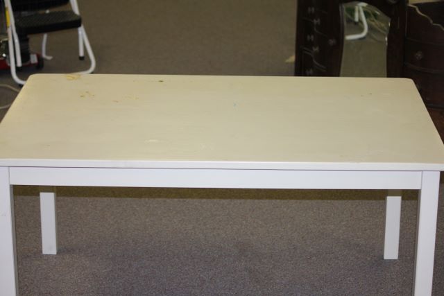 White Child's Play Table with Chairs (a little wear on top); 22"h., 45"w., 30"d. White Child's Play Table with Chairs (a little wear on top); 22"h., 45"w., 30"d.