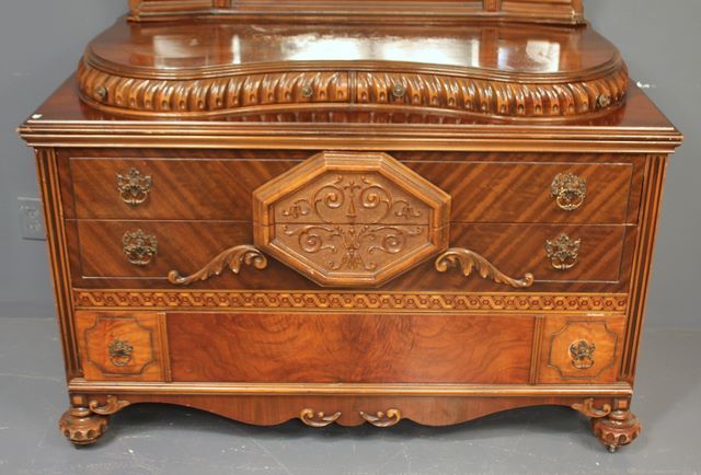 Kidney Shaped 1940s Walnut Veneer Dresser with Beveled Swing Out Mirrors Two serpentine drawers, three long drawers with elaborate carving all supported by carved bun feet. Matches previous lot 51"w., 23"d., 78"h. Kidney Shaped 1940s Walnut Veneer Dresser with Beveled Swing Out Mirrors Two serpentine drawers, three long drawers with elaborate carving all supported by carved bun feet. Matches previous lot 51"w., 23"d., 78"h.
