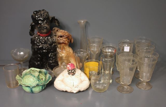 Group of Miscellaneous Items, including; various glasses, top to Mammy cookie jar, covered cabbage dish, 1950's TV lamp of two dogs (one glass eye missing) 14" h., 11" w. Group of Miscellaneous Items, including; various glasses, top to Mammy cookie jar, covered cabbage dish, 1950's TV lamp of two dogs (one glass eye missing) 14" h., 11" w.