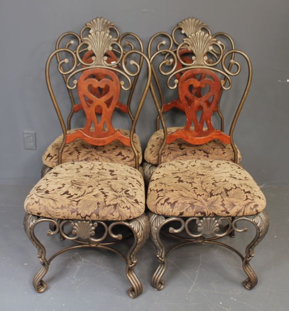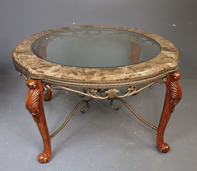 Contemporary Beveled Glass and Marble Breakfast Table along with Four Iron Chairs; table 53" dia., 32" h.; chairs 44" h. (matches previous lot) Contemporary Beveled Glass and Marble Breakfast Table along with Four Iron Chairs; table 53" dia., 32" h.; chairs 44" h. (matches previous lot)
