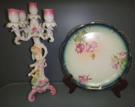 Two Pieces of Porcelain, consisting of a cupid five arm candlestick (two arms are missing the candle cups) 16" h., 6 1/2" dia.; along with a large Bavarian hand painted plate 12 1/2" dia. Two Pieces of Porcelain, consisting of a cupid five arm candlestick (two arms are missing the candle cups) 16" h., 6 1/2" dia.; along with a large Bavarian hand painted plate 12 1/2" dia.