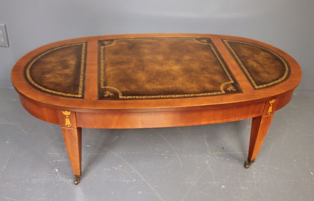 Vintage Leather Top Oval Coffee Table; 45 1/2" w., 15 1/2" h. Vintage Leather Top Oval Coffee Table; 45 1/2" w., 15 1/2" h.