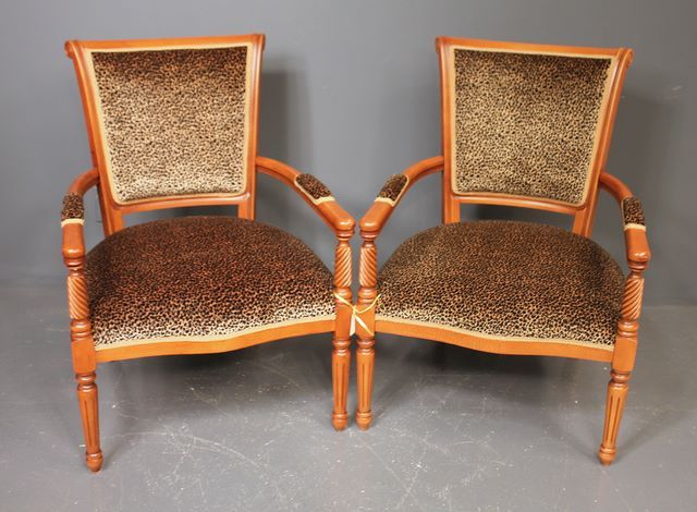 Pair of Occasional Arm Chairs, twisted arms, leopard upholstery; 26 1/2" w., 26"' d., 36" h. Pair of Occasional Arm Chairs, twisted arms, leopard upholstery; 26 1/2" w., 26"' d., 36" h.