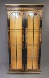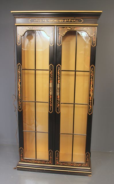 Black Lacquer with Hand Painted Flower Lighted Display Cabinet, has two glass shelves; 36 1/2" w., 12" d., 79 1/2" h. Black Lacquer with Hand Painted Flower Lighted Display Cabinet, has two glass shelves; 36 1/2" w., 12" d., 79 1/2" h.