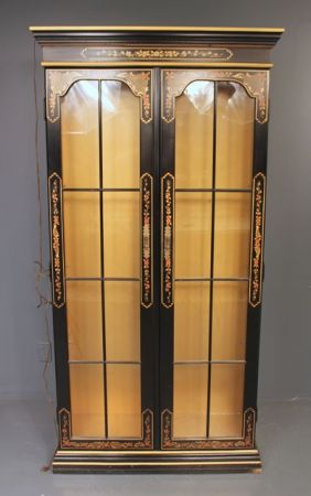 1172 Black Lacquer with Hand Painted Flower Lighted Display Cabinet