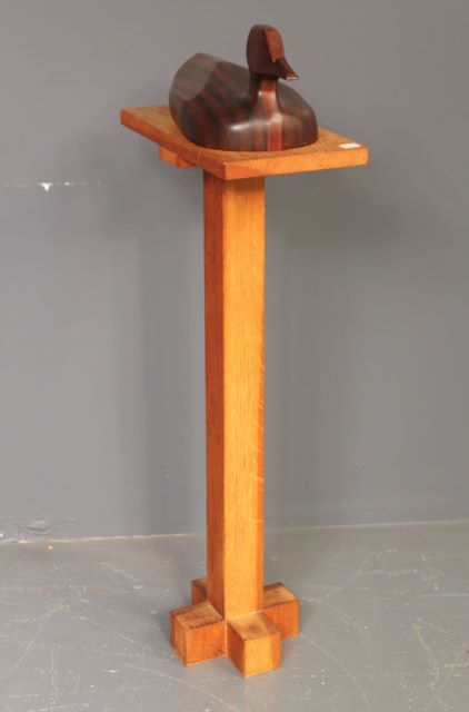 Oak Stand with Duck Mounted on Top; 8 1/2" w., 15 1/2" d., 44 1/2" h. Oak Stand with Duck Mounted on Top; 8 1/2" w., 15 1/2" d., 44 1/2" h.