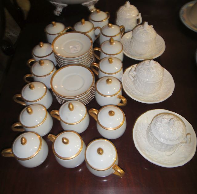 Group of Covered Pot de Creams, Fritz and Floyd sixteen cups and sixteen saucers along with four Italian porcelain pot de creams, one saucer missing. Group of Covered Pot de Creams, Fritz and Floyd sixteen cups and sixteen saucers along with four Italian porcelain pot de creams, one saucer missing.