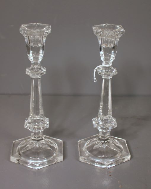 Pair of Six Sided Base Glass Candlesticks; 10 1/2" h. Pair of Six Sided Base Glass Candlesticks; 10 1/2" h.