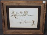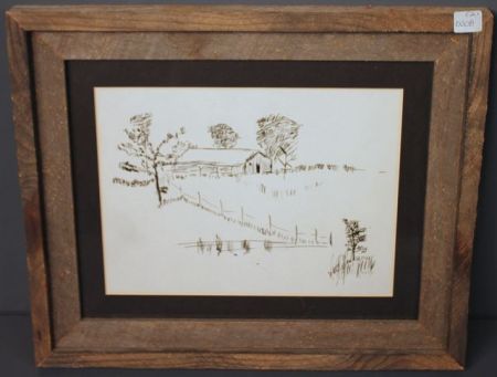 Pencil Etching of Barn, signed RJB in lower right, cypress frame; from a local estate; 17 1/2" w., 14 1/2" h. Pencil Etching of Barn, signed RJB in lower right, cypress frame; from a local estate; 17 1/2" w., 14 1/2" h.