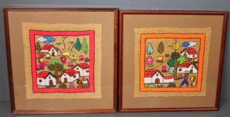 1226 Pair of Yarn Stitched Pictures on Burlap