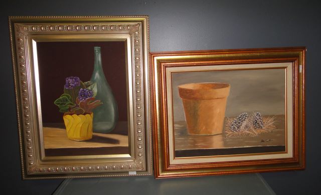 Two Oil Paintings by Lee Coker; one of purple violets and bottle 18" w., 22" h. and one of flower pot with pine cones 21 1/2" w., 17" h. Two Oil Paintings by Lee Coker; one of purple violets and bottle 18" w., 22" h. and one of flower pot with pine cones 21 1/2" w., 17" h.