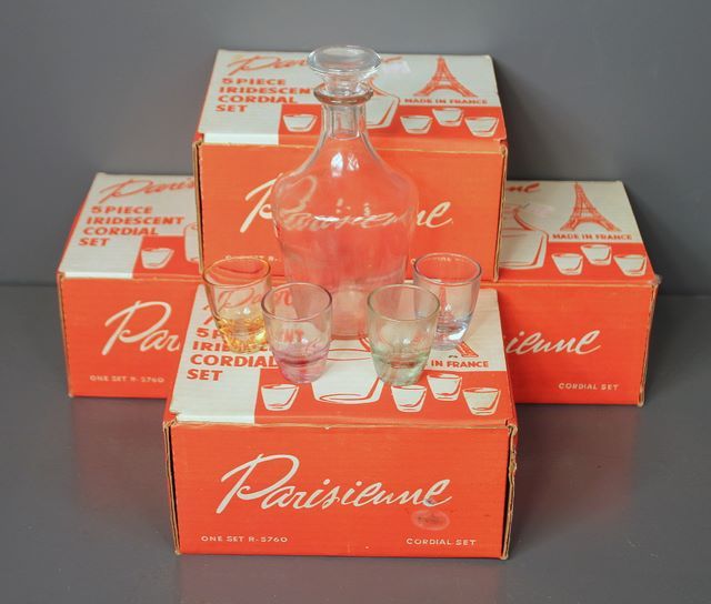 1240 Four Sets of Parisienne Five Piece Iridescent Cordial Sets in Original Boxes