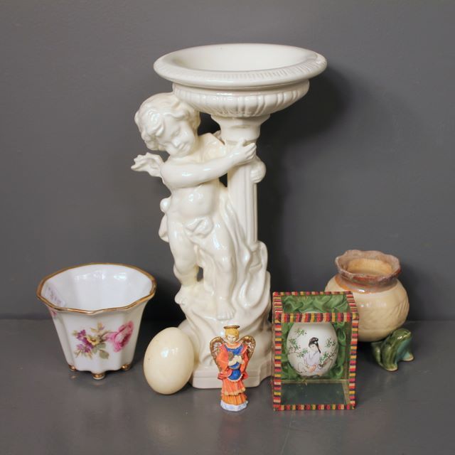 Group of Decorative Items, including; small porcelain flower pot 4" dia., porcelain egg, hand painted egg in shadow box 2 3/4" w., small pot with frogs 4" dia., cupid compote 11" h. Group of Decorative Items, including; small porcelain flower pot 4" dia., porcelain egg, hand painted egg in shadow box 2 3/4" w., small pot with frogs 4" dia., cupid compote 11" h.