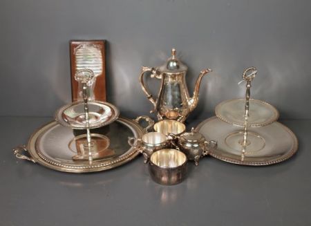 Group of Silverplate Items; two two-tier trays, two 3 3/8" bowls, three piece E.R. Rogers Tea set, round tray 16" dia., 9" cheese server Group of Silverplate Items; two two-tier trays, two 3 3/8" bowls, three piece E.R. Rogers Tea set, round tray 16" dia., 9" cheese server