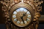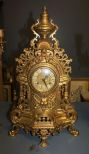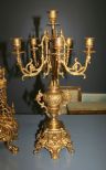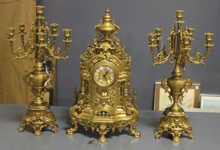Louis XVI Style Brass Farbel Clock Set with bim bam mechanism accompanied by a pair of candlesticks. 23" h. clock. Louis XVI Style Brass Farbel Clock Set with bim bam mechanism accompanied by a pair of candlesticks. 23" h. clock.