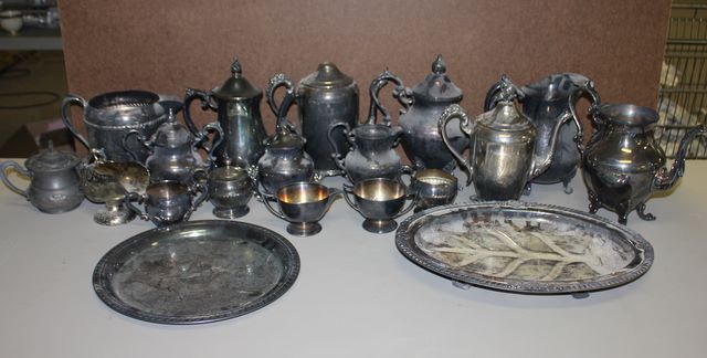 Group of Silverplate Items, group includes; eight silverplate pitchers, Tree of Life Tray, round tray and five cups Group of Silverplate Items, group includes; eight silverplate pitchers, Tree of Life Tray, round tray and five cups