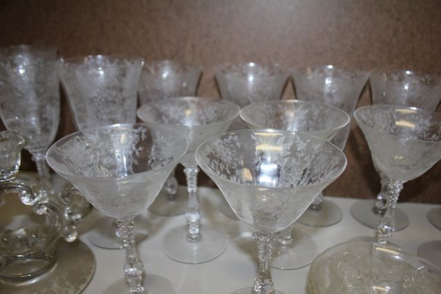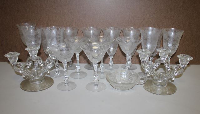 Group of Etched Glassware, group includes; sixteen etched glasses, pair of etched candleholders and dish (some chips on some rims) Group of Etched Glassware, group includes; sixteen etched glasses, pair of etched candleholders and dish (some chips on some rims)